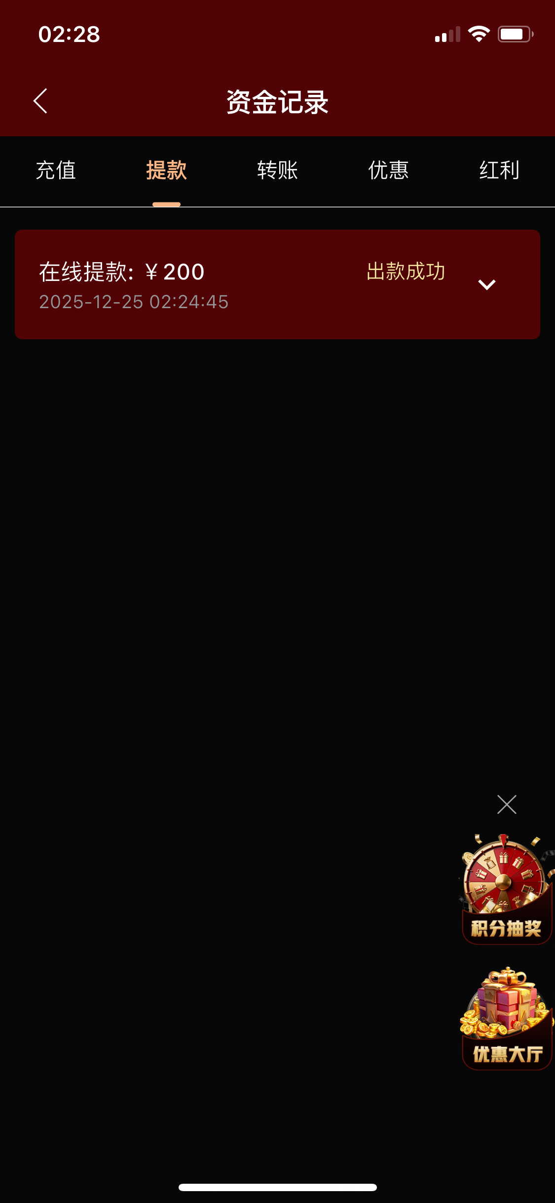 代码自助38元,8水,完成要求需要存款100(不可参与其他优惠),最多提款200元,具体规则自己看图。不喜欢可以不要。【代码可以先兑换,左上角点击彩金商场自助兑换】