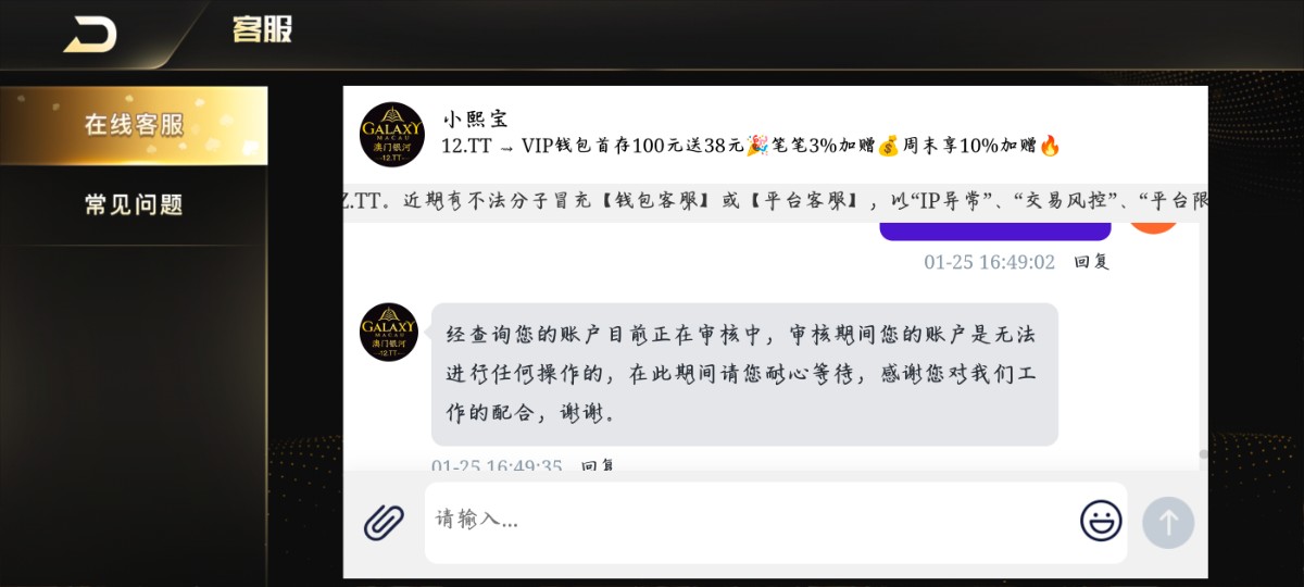 正常充值娱乐,第一次提现不给提退回了,后面打上去500了提现说要连续客服核实,联系客服之后就是冻结账号说要审核。避雷银河这个台陆陆续续充值了八千多一次没提现过,结果这次好不容易赢个几百块不给提现,说什么审核也是搞笑的